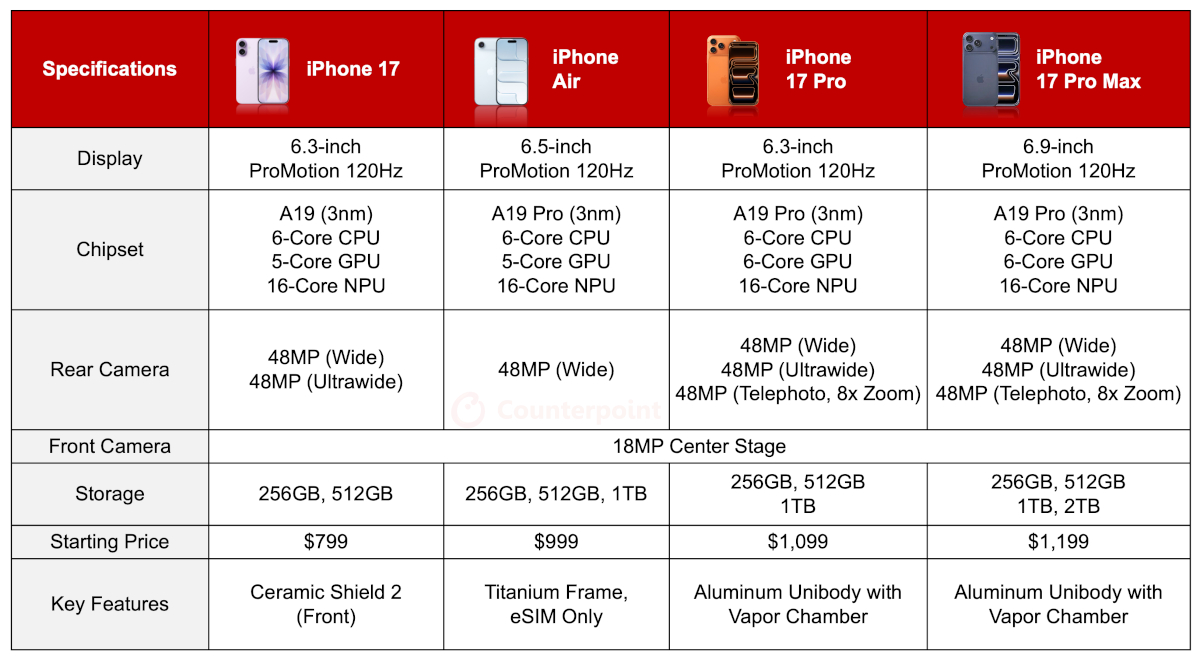 One of the biggest changes this year is that the Air model will be eSIM-only worldwide. Apple says removing the physical SIM card saves space to house a bigger battery, and eSIM is easy to use and offers better security. The iPhone Air will be available at a starting price of $999 for the 256GB storage model and will also be available in 512GB and 1TB variants.